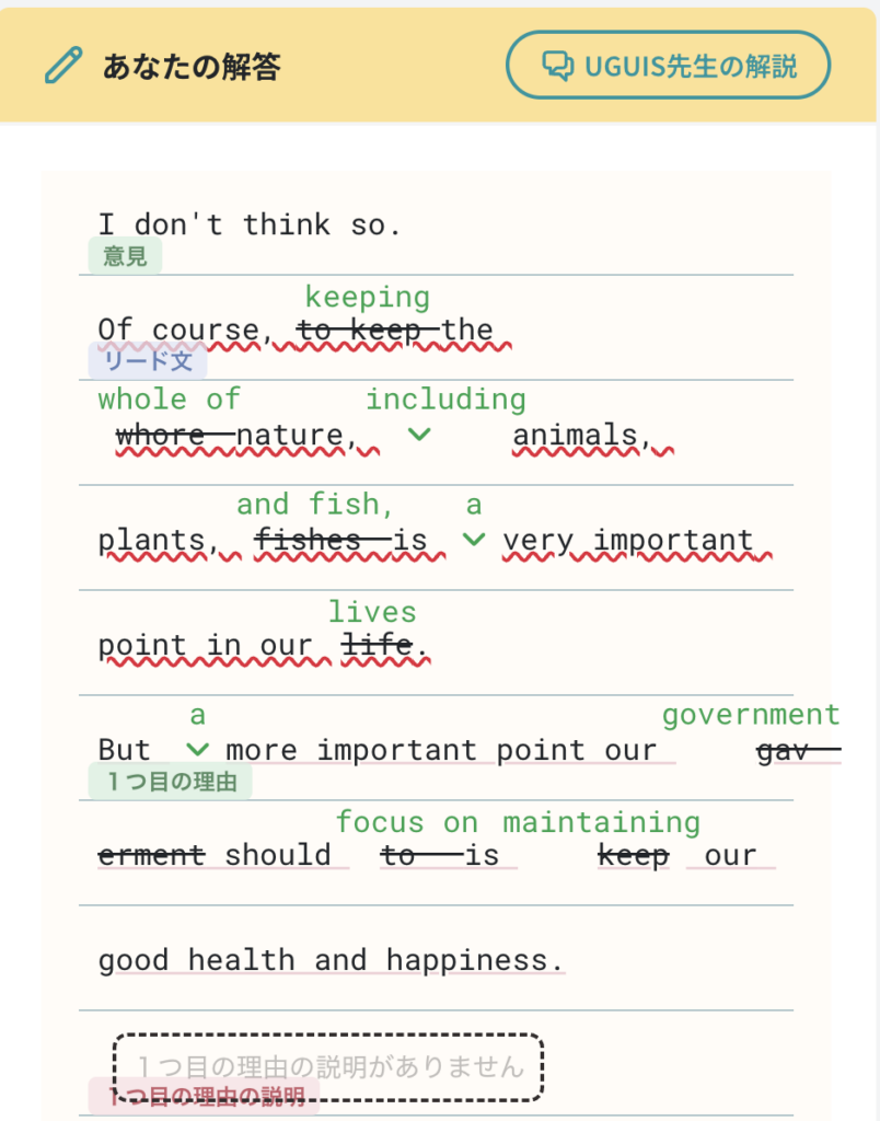 これ、普通に人間の先生に添削してもらうと、結果が返ってくるまでに数日かかることもありますよね。でもUGUIS.AIなら、書いた直後に結果が分かるので、記憶が新しいうちに復習できます。