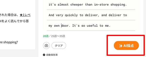 英作文を書いたら、AIが即座に採点して、改善点をフィードバックしてくれます。これは本当に速いです。