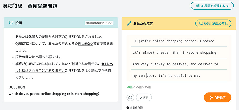 これは英検や大学入試のライティング対策に特化していて、しかもAIが即座に採点・添削してくれるという画期的なサービスです。