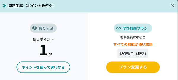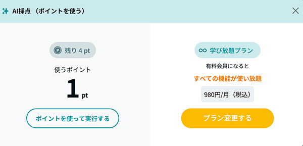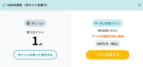 問題を生成してもらうのに1ポイント、解答をしAI添削してもらうのに1ポイント、UGUIS先生にアドバイスしてもらおうと思えば追加で1ポイント。つまり1つの質問解答添削で、2ポイントもしくは3ポイント必要ということになります。(有料会員は料金に全て込み)