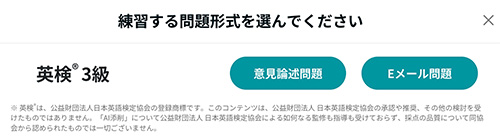 対象の級が5つ選べます(準1級/2級/準2級プラス/準2級/3級)。さらに「意見論述問題」「要約問題」「Eメール問題」から希望のものを選べます。質問があり、解答します。
