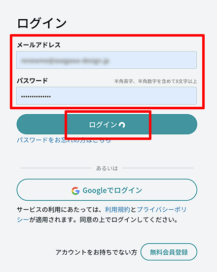 こういう入力画面が出ますので、登録したメールアドレスとパスワードを入れて「ログイン」を押せば入ることができます。